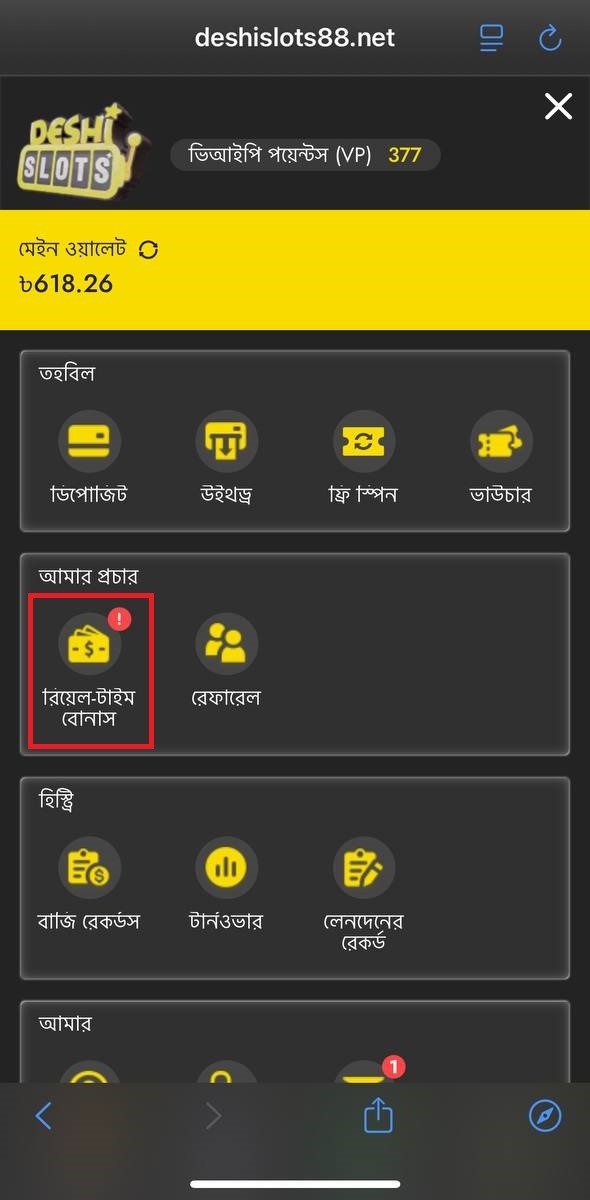 ২. মাই আকাউন্টে-এ যান, তারপর মেইন ওয়ালেট ট্যাবে ক্লিক করুন এবং রিয়েল-টাইম বোনাস আইকন নির্বাচন করুন।