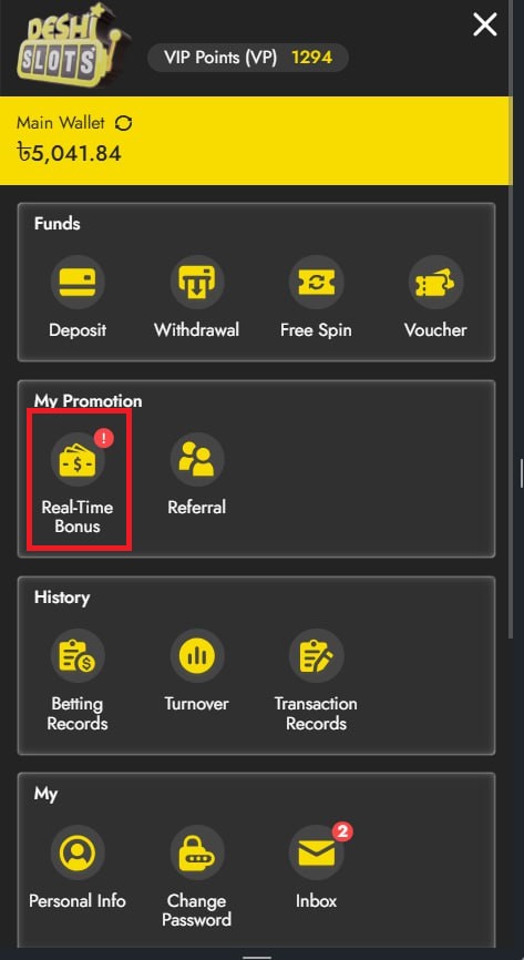 2. Go to My Account, then click the Main Wallet tab and select the Real-Time Bonus icon.