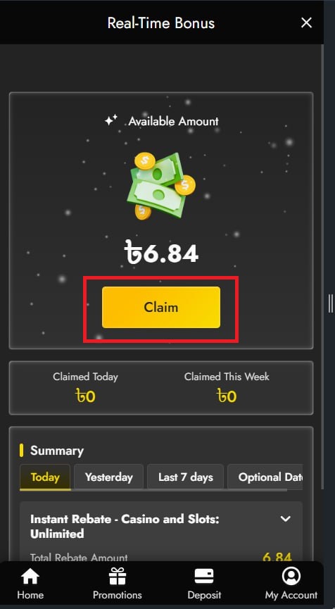 3. Under Available Amount, click Claim to redeem your Rebate or Rescue bonus.