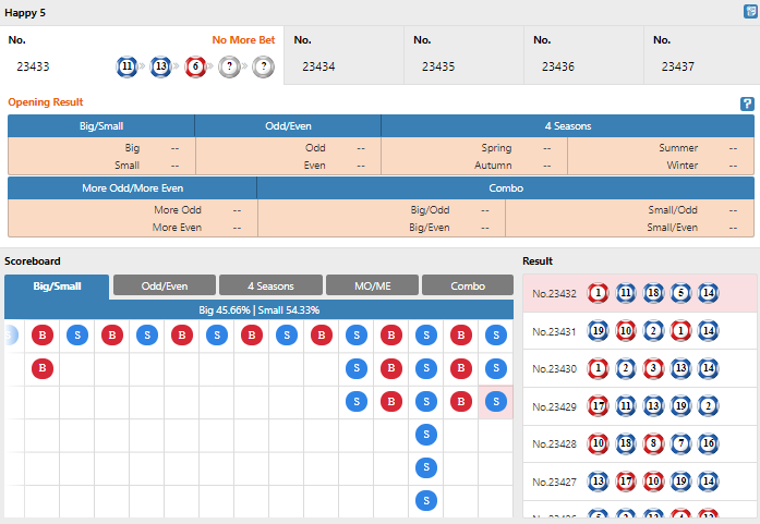 Happy 5 is played by randomly drawing 5 balls from 20 numbered balls (01 to 20). The results are based on the combination of the 5 numbers drawn.