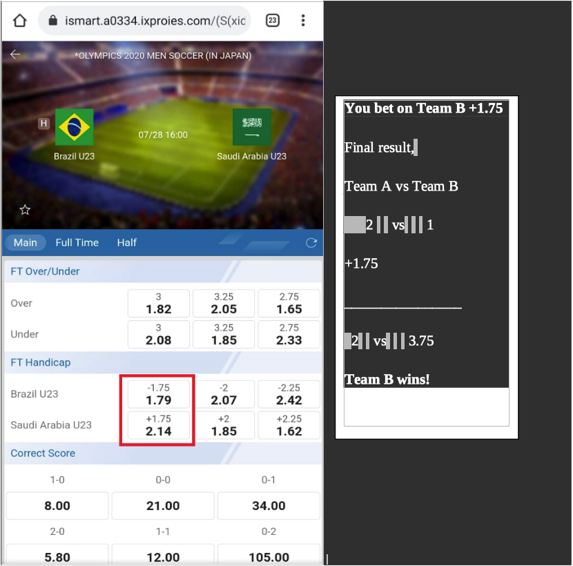 For example, if team A and B are playing a soccer game and the line is +1.75 for team A which means that they’re the underdogs, If they lose by 1 or less you’re going to win the bet. Final result of team A is 1 and team B is 2. If you bet on team A in that case you would win your bet.